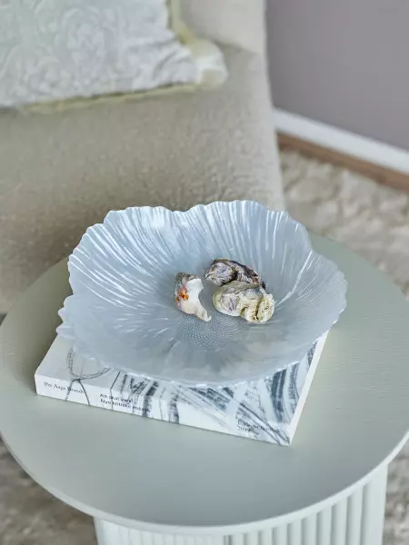 Iani-skålen fra Bloomingville er laget av glass med en perlemorsoverflate og et elegant, blomsterlignende design. Skålen er dekorativ i seg selv, men kan også brukes til små pyntegjenstander eller som en del av et utstillingsvindu.