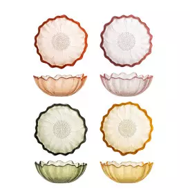 Kana Bowl fra Bloomingville er et sett med fire glasskåler formet som blomster, med myke kronbladlignende kurver og en teksturert midtdel. Hver skål er sprayfarget, noe som skaper en subtil variasjon i tone på tvers av rosa, ravfargede og lysegrønne nyanser. Laget av glass.