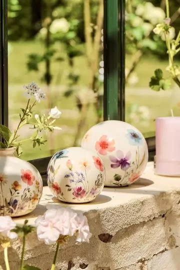 Vakker keramisk deco-ball med lekent blomsterdesign. Perfekt som dekorativt innslag på et fat, i en bolle eller alene på en hylle. Blomsterprintet er pent påført for hånd, så ingen to er helt like.