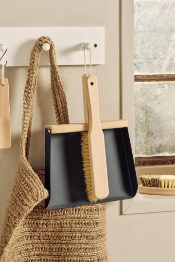 Fejebrett med kost – stilig design i metall, bøk og naturbørste. Med bomullssnor for enkel opphenging. Perfekt for rask og effektiv feiing i det moderne hjemmet.