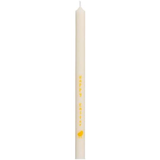 Høyt og elegant lys med påsketekst og en liten, søt kylling – et festlig blikkfang på påskebordet. Kvalitetslys produsert i EU. Husk lysestaken slik at den står trygt og vakkert