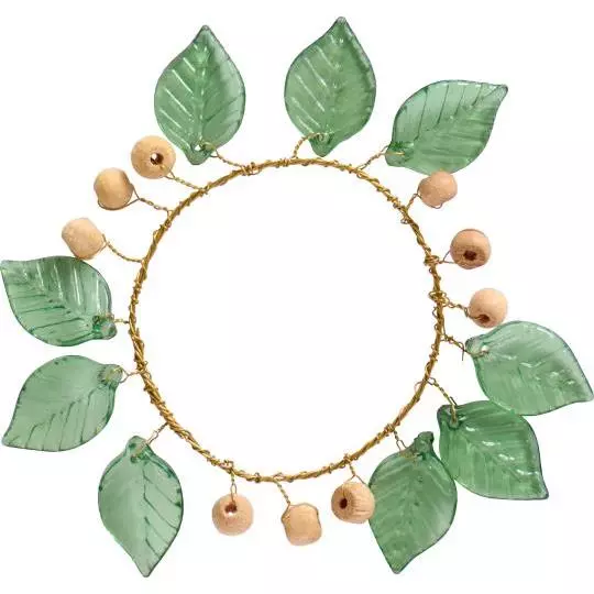 Håndlaget minikrans laget av metall med grønne blader. Bruk den som kleshenger, serviettring eller til pynt på bordet.