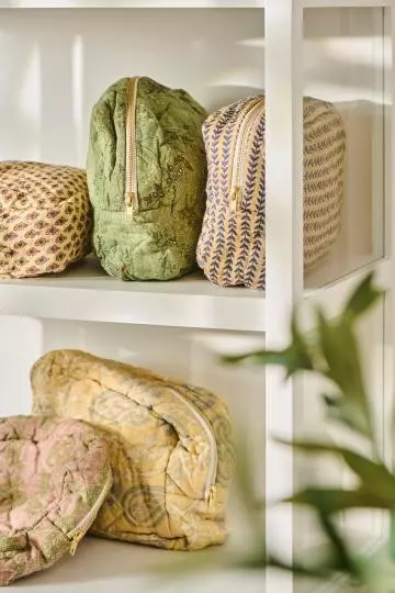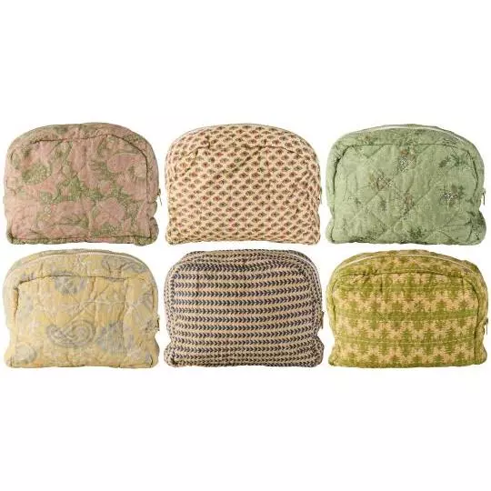 Myk, vattert toalettmappe i 6 sjarmerende mønstre – perfekt til sminke og toalettsaker. Praktisk og fargerik oppbevaring for både hverdagsliv og høytider.